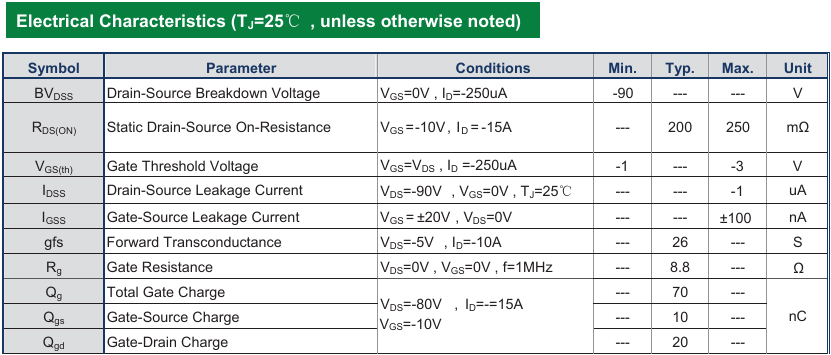高耐压与鲁棒性: -90V的漏源电压(VDS)额定值提供了充足的设计余量。其先进的硅技术确保了良好的雪崩击穿能力,能够承受负载电感关断时产生的反向电压冲击,增强了系统在恶劣环境下的可靠性。