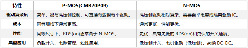 结论: 当您的设计需要简化高压侧控制逻辑、追求极低的待机功耗或进行线性控制时,CMB20P09这样的高性能P-MOSFET是无可替代的优选。