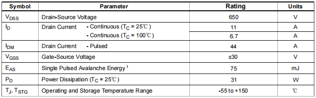电流能力:在Tc=25℃条件下,其最大连续漏极电流(ID)为11A。
