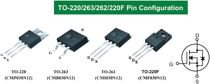 如图CMP030N12采用TO-220、TO-263、TO-262、TO-220F四种常规封装,分别具有器件绝缘特性强,散热性优,体积窄小等特点。多种封装为用户提供多种选择性,从而提高了器件兼容性。