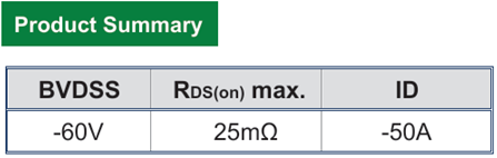 导通电阻(R<sub>DS(on)): 约25mΩ (@ VGS=-10V)