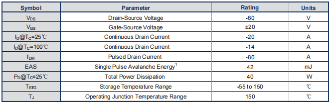 电流能力:在Tc=25℃条件下,其最大连续漏极电流(ID)是-20A。