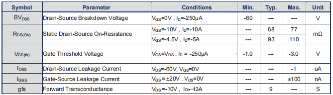 耐压能力:CMD20P06的耐压(BVDSS)为-60V。