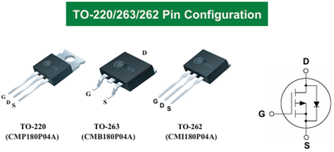 CMB180P04A采用行业标准的TO-220、-263(D2PAK)、TO-262封装,该封装以其优异的散热性能和机械强度著称。