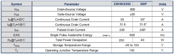 电流能力:在Tc=25℃条件下,其最大连续漏极电流(ID)为50A。