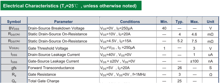 1.极低的导通电阻(Rds(on)):在Vgs=10V时,最大值仅为4.6mΩ。这直接最小化了导通状态下的功耗(P = I² * Rds(on)),提升了系统整体效率,并减少了散热需求。