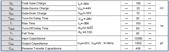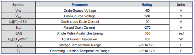 电流能力:在Tc=25℃条件下,其最大连续漏极电流(ID)是-90A。