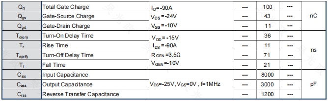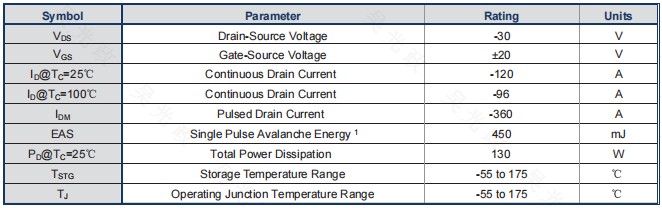 电流能力:在Tc=25℃条件下,其最大连续漏极电流(ID)是-120A。