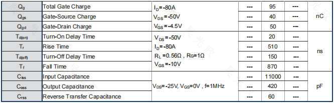 电流能力:在Tc=25℃条件下,其最大连续漏极电流(ID)是-80A。