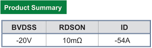 1.3 导通电阻 10mΩ (RDS(on)):这是该器件的核心优势。在 VGS = -4.5V驱动下,10mΩ 的低导通电阻意味着极小的传导损耗。例如,在 20A 电流下,导通损耗仅为 I²×R = 20*20*0.01 = 4W ,这在功率回路中是可以接受的。