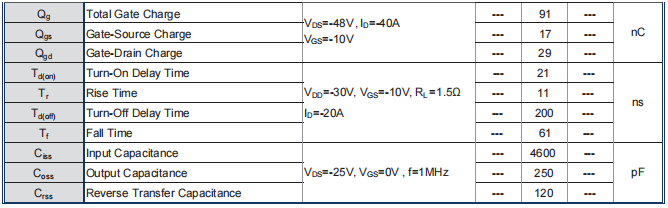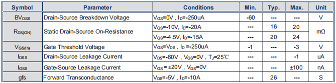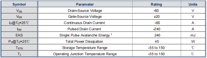 电流能力:在Tc=25℃条件下,其最大连续漏极电流(ID)是-60A。
