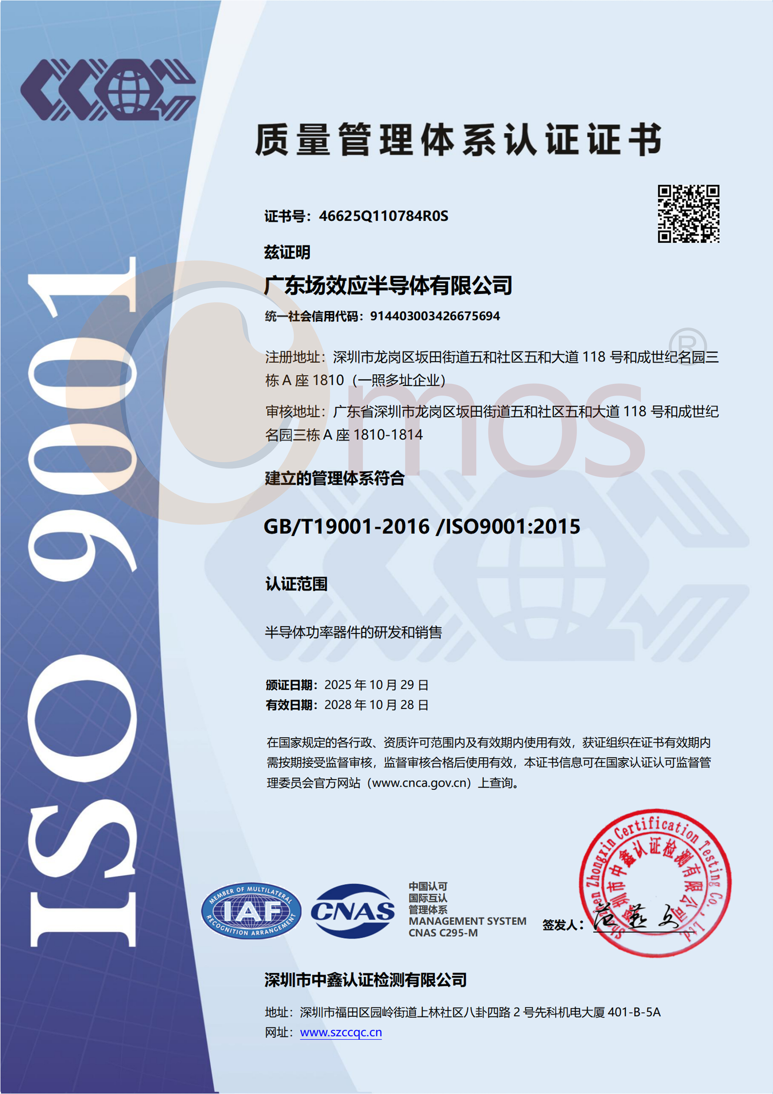 广东场效应半导体ISO9001质量管理体系认证和五星级售后服务认证更新